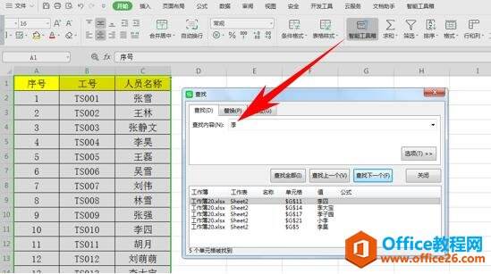 接下来我们看精确查找的方法,依旧单击工具栏查找功能,在查找内容处输入李?,注意这里的问号是英文状态下的问号,中文状态下的无效。单击查找全部,我们看到所有李开头的姓名就查找出来了。