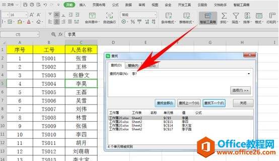 弹出查找的对话框,输入李,单击查找全部,就能查找出表格当中所有包含李的姓名,这就叫做查找当中的模糊查找。