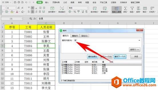 再看一种,我们在查找内容处输入李*,然后单击查找全部,出来的数据就不止李开头的姓名了,包括所有含李的姓名。