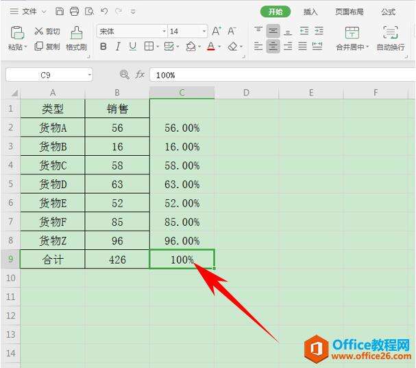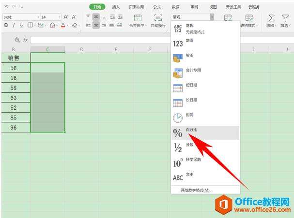首先,我们选中数据,将销售转换为百分比,单击工具栏开始下的下拉菜单,将单元格格式设置为百分比。