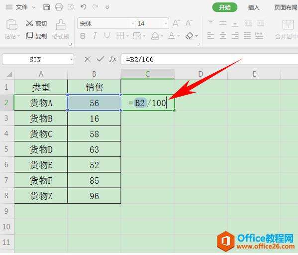 然后在单元格当中输入公式=B2/100,如下图所示。