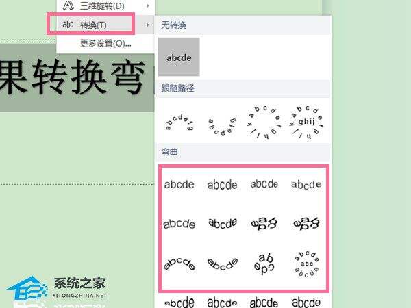 2、点击转换,在弯曲一栏下选择一种弯曲类型即可设置文字弯曲。