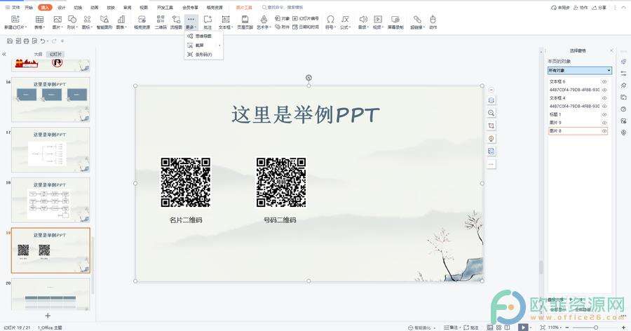 第一步:打开电脑版WPS演示文稿,点击“插入”选项卡,点击“二维码”,如果没有,则点击“更多”,在其下拉选项中点击“二维码”;