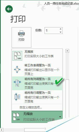 其实,这时候我们只需从打印设置窗口中,把缩放选择列表中的选项调整为“将所有列调整为一页”,这样打印时就不会分开两页或更多页打印了。总体速度也提升了。