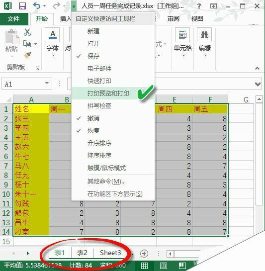 如果要一次性将工作簿中的多张工作表打印出来,可以先按下Ctrl键,然后依次点击表名标签列表中的工作表名称,选择要打印的工作表;若是所有打开的工作表要一次打印,则先按下Shift键盘,然后直接点击最后一张表的标签即可全选。之后执行打印命令即可。为方便访问打印预览,我们还可将“打印预览和打印”按钮设置在窗口的左上角边框上。