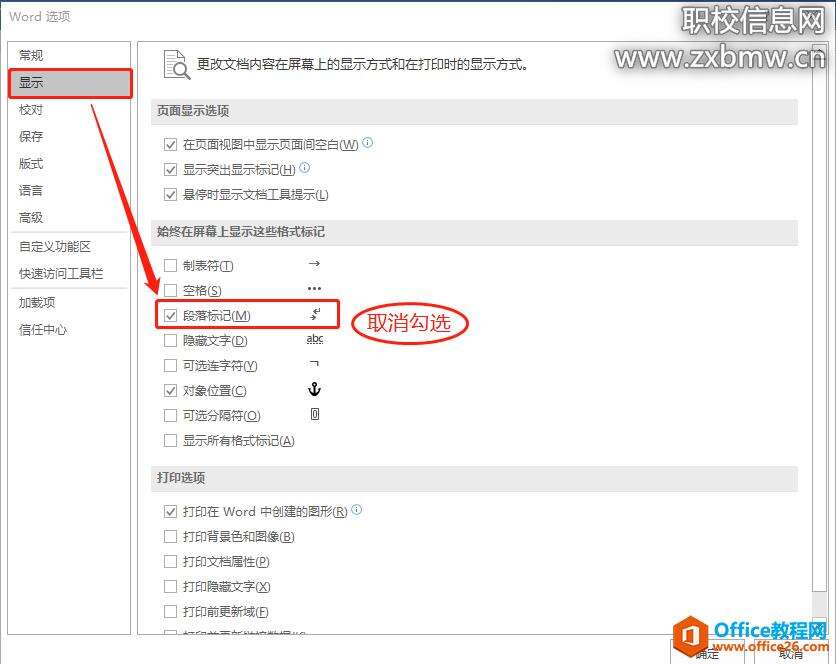 步骤分别是:点文件–》选项–》“显示”–》“段落标记取消勾选”