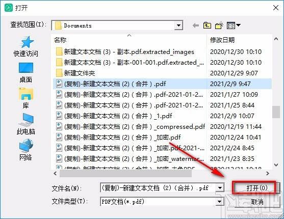 2.然后界面上就会出现一个文件打开窗口,我们在窗口中将需要转为word的PDF选中,再点击页面右下角的“打开”按钮即可。