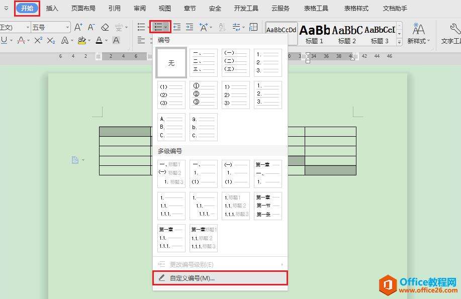 选中单元格后,单击开始工具栏下的自动编号右侧的小箭头,在下拉菜单中选择自定义编号。
