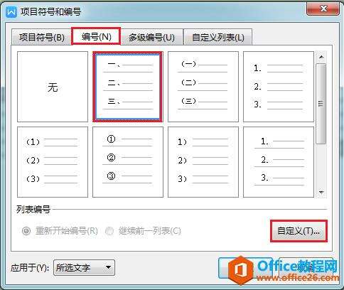 在弹出的对话框中选择除了无以外任意一个编号类型,然后单击右下角的自定义选项。