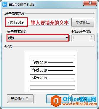 在自定义编号列表对话框中,编号样式选择无,在编号格式输入要填充的内容,单击确定。