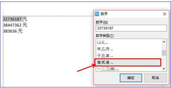 系统会自动弹出一个数字窗口,我们在数字类型处选择以汉字形式出现的壹贰参,如图3