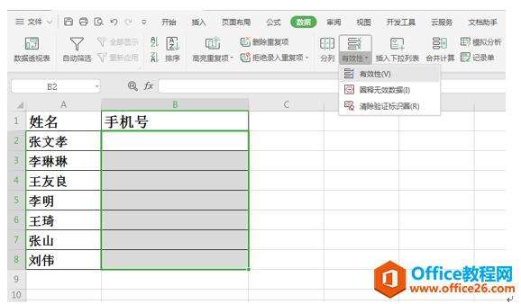 首先,我们单击工具栏数据下的有效性,在有效性的下拉菜单中选择有效性。