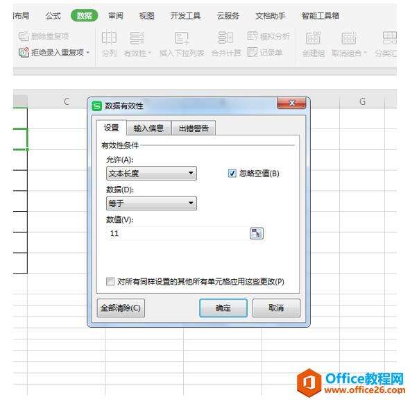 弹出有效性条件的对话框,在允许里选择文本长度,然后在数据里选择等于,在数值里输入11,因为手机号都是11位。