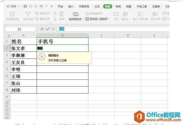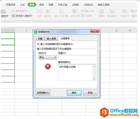 然后单击出错警告,然后在错误信息里输入需要提示的错误语句,比如下图里“手机号是11位哦”,设置完毕后单击确定
