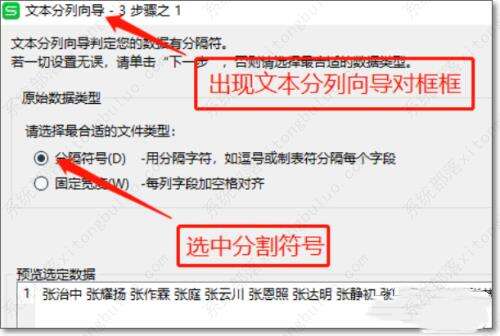 3、出现“文本分列向导”对话框,选择“分隔符号”点击“下一步”。