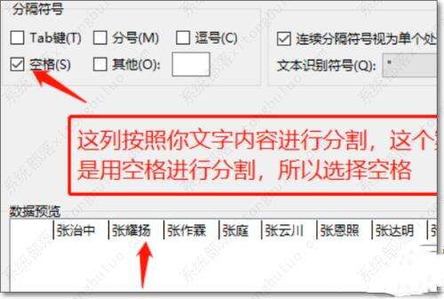 4、出现下一个对话框,根据你的内容,按照你的规则,选择通过什么方式分隔,这里选择“空格”来分隔,你选中后,下面有分隔的效果,然后点击“下一步”。
