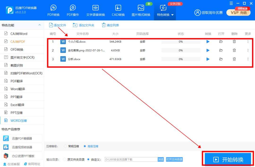 第一步:下载完成后,进入首页,在界面选择【特色功能】,点击【Word压缩】功能;然后点击虚线框添加文件,或者直接将文件直接拖拽到界面中;