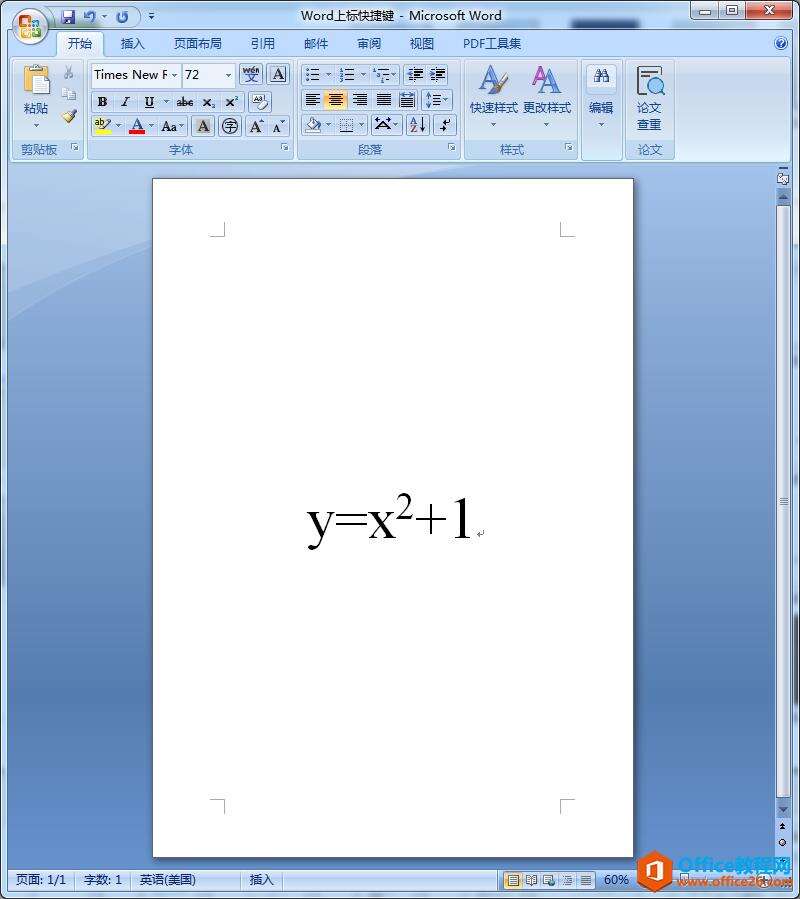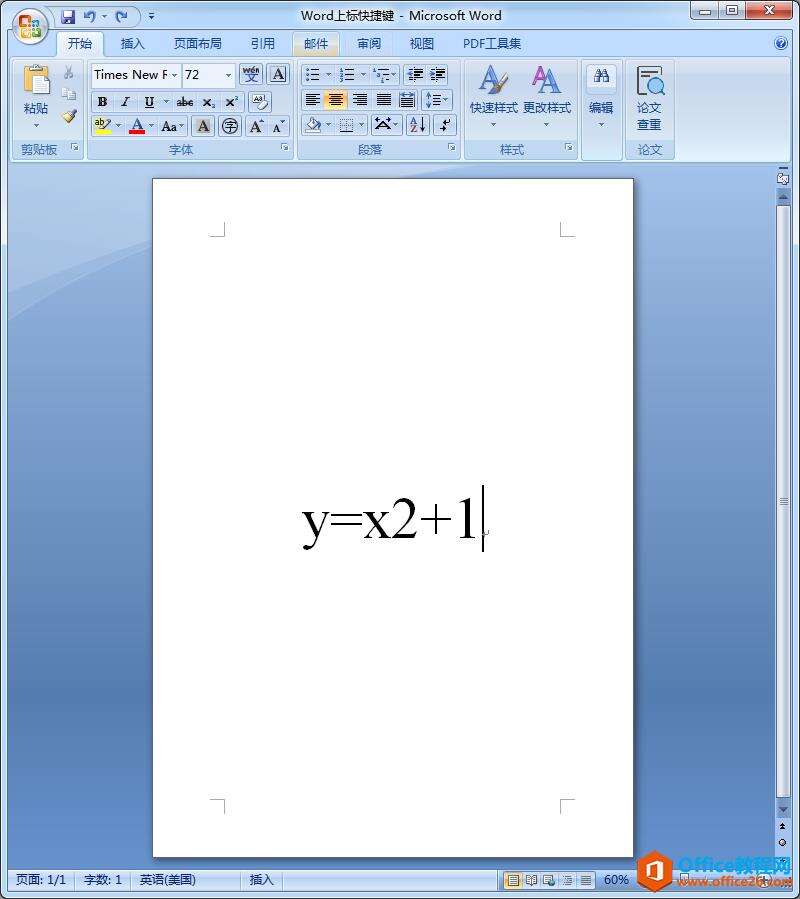 第一步:启动Word2007(未安装可以点击office2007安装包),输入字母和上标数字,比如一元二次函数y=x2+1;