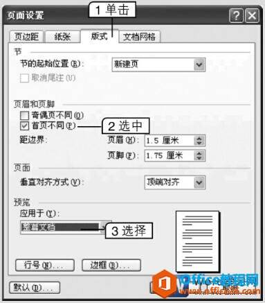 2、单击“版式”选项卡,选中“页眉和页脚”选项栏中的“奇偶页不同”复选框,在“应用于”下拉列表框中选择“整篇文档”选项,单击确定按钮,如图2所示。