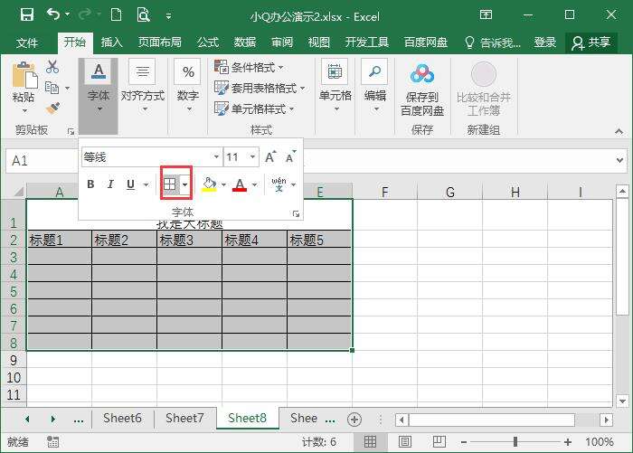 2、如果内容包含标题行的话,可以选中多个单元格,点击开始下的合并后居中,再输入内容。