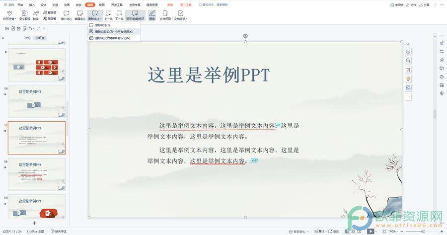 第一步:点击打开WPS演示文稿,定位到需要删除标记的幻灯片页中,点击“审阅”选项卡,点击“删除批注”并在其下拉选项中点击“删除当前幻灯中所有标记”;