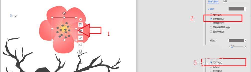 4、接下来是画梅花了。鲜花花瓣,再画花蕊,将花瓣花蕊组合就是梅花了。一朵不够,那么我们就复制、粘贴、移动,布满整个枝头,这样看起来就好看多了。