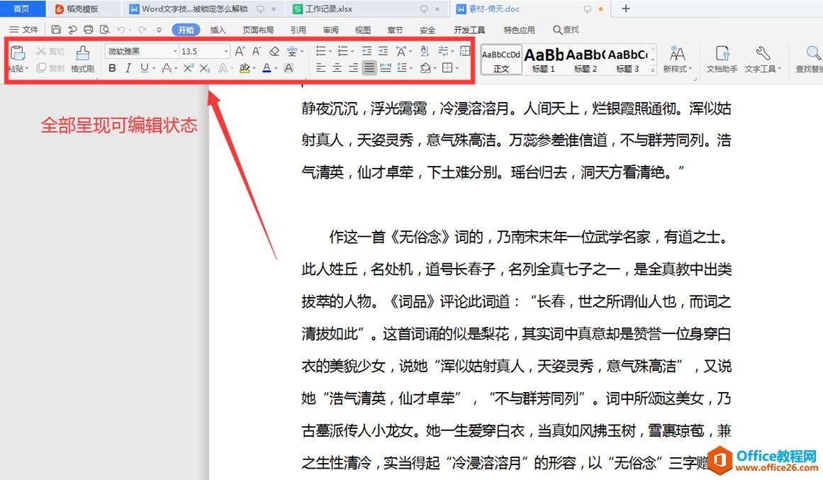 此时我们可以看到文档已经被解锁,【开始】菜单中的各种工具都处于可编辑状态: