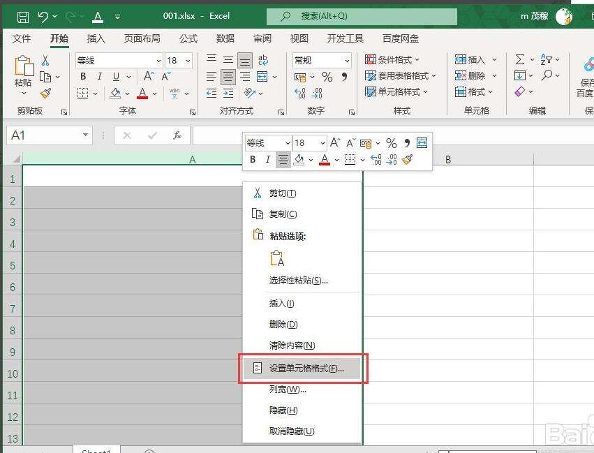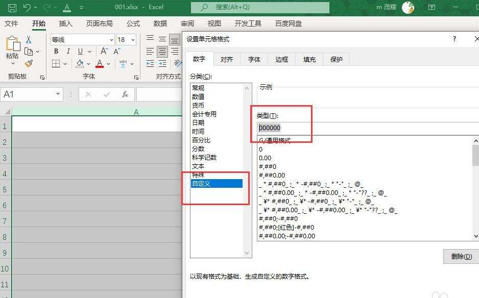 弹出“设置单元格格式”面板,点击“自定义”清空类型中的内容。