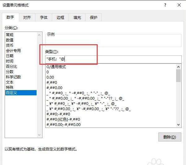 在“类型”中输入“手机:”@,“手机:”为前缀文字,@为单元格输入内容,点击“确定”。