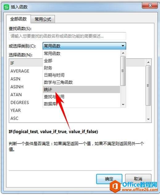 选择后弹出插入函数对话框,在选择类别处选择统计。