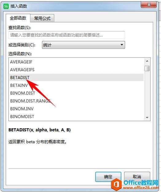 在统计函数中找到BETADIST 函数,鼠标单击。