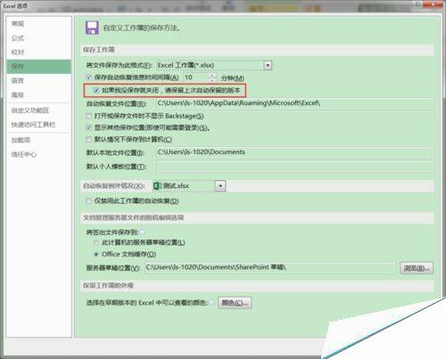 在【保存工作簿】栏中勾选【如果我没保存就关闭,请保留上次自动保留的版本】复选框,点击【确定】
