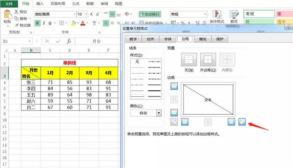 第二步:点击单元格,右键选择单元格格式设置—边框,然后点击边框线里面的单元格对角线,这样我们就自动添加号了单斜线。如下图所示: