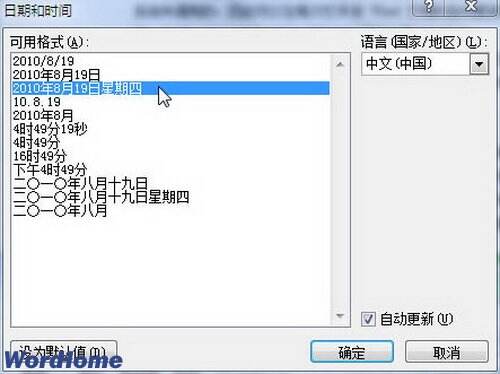 第2步,打开“日期和时间”对话框,在“可用格式”列表中选择合适的日期或时间格式,也可以选择日期和时间的组合格式。如果选中“自动更新”复选框,则可以在每次打开该Word文档时,根据当前系统的日期和时间自动更新。设置完毕单击“确定”按钮,如图2所示。