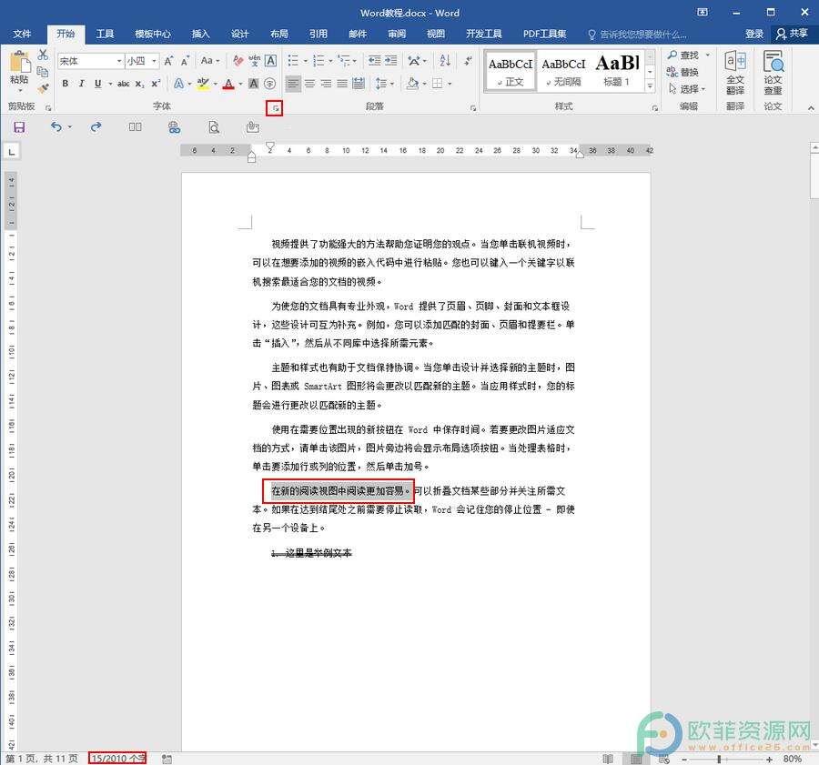 第一步:打开Word文档,选中需要设置隐藏的文本内容,点击“字体”栏右下角的小图标;