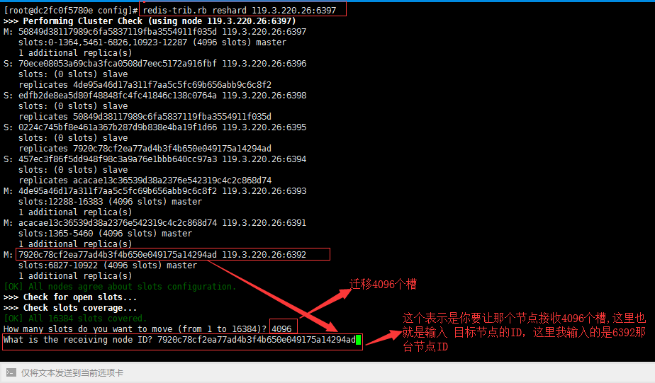 下线节点需要把自己负责的槽迁移到其它节点上,原理与之前的节点扩容的迁移槽过程一致,但是过程收缩正好和扩容迁移方向相反,下线节点变为源节点,其它主节点变为目标节点,源节点需要把自身负责的N(因为上篇博文我们一共是4个节点,所以这里的N就是4096)个槽均匀地迁移到其它主节点上。