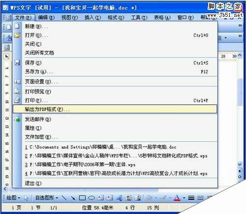hmoban 办公教程 2024-03-19 用WPS将Word文档转化成PDF格式 办公教程导读 收集整理了【用WPS将Word文档转化成PDF格式】办公软件教程,小编现在分享给大家,供广大互联网技能从业者学习和参考。文章包含98字,纯文字阅读大概需要1分钟。 办公教程内容图文 第二步:选择[文件]-[输出为PDF格式],在随即出现的对话框内设置PDF的格式输出需要,点击[确认]就OK了! 看看效果吧! 办公教程总结 以上是为您收集整理的【用WPS将Word文档转化成PDF格式】办公软件教程的全部内容,希望文章能够帮你了解办公软件教程用WPS将Word文档转化成PDF格式。 如果觉得办公软件教程内容还不错,欢迎将网站推荐给好友。 hmoban主题是根据ripro二开的主题,极致后台体验,无插件,集成会员系统自学咖网 » 用WPS将Word文档转化成PDF格式