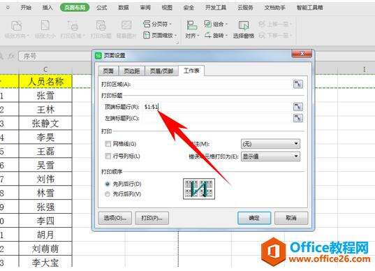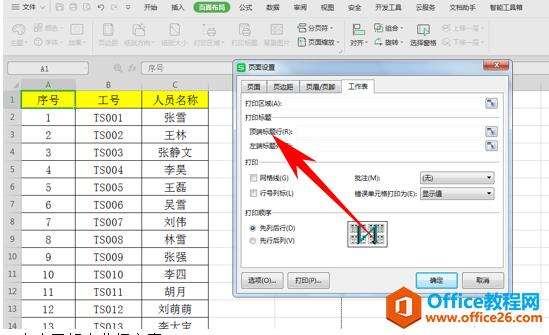 弹出页面设置的对话框,选择工作表选项,找到打印标题的选项,选择顶端标题行。