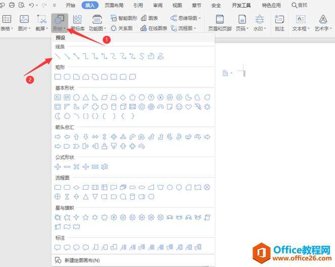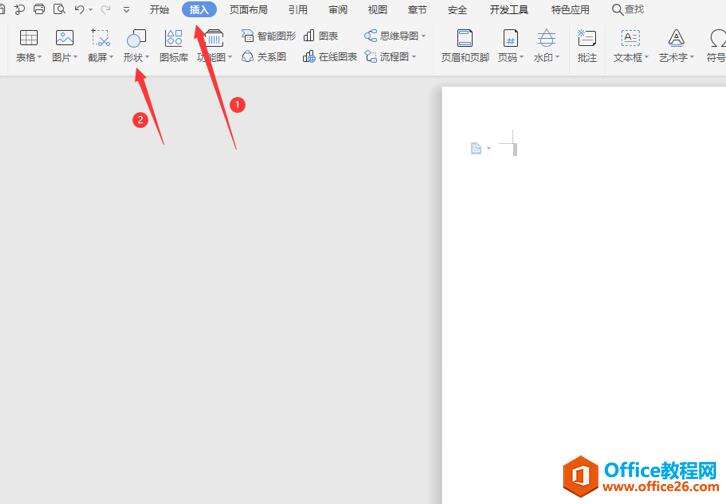 第二步:在新建的空白文档中点击菜单栏里面的“插入”,进而在下面工具栏找到“形状”选项: