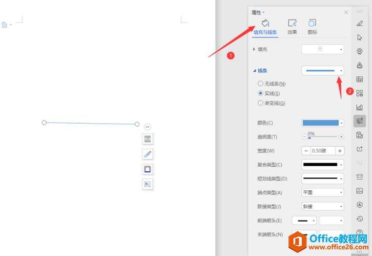 第六步:在“属性”设置框里面选择“填充与线条”,然后在下面的“线条”项目中点选旁边倒黑三角形,在下拉菜单中选择虚线即可: