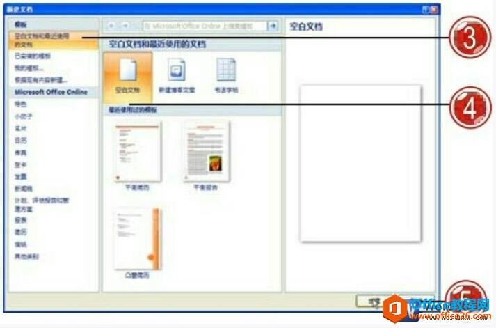 3、打开“新建文档”对话框,在“模板”列表中单击“空白文档和最近使用的文档”选项。
