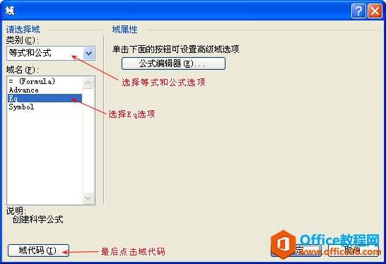步骤二、点击【域】选项,将会弹出域的窗口,在【类别】选项中选择【等式和公式】,接着选择域名为【Eq】,然后再左下角点击【域代码】按钮。如图所示: