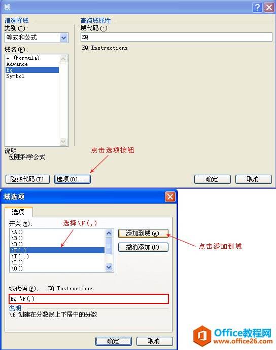 步骤三、点击【域代码】之后,接着【选项】按钮,会弹出【域选项】窗口,在开关栏中选择【F(,)】选项【添加到域】,将会出现【域代码】为EQ F(,)的代码,其中括号中逗号前面的是分子,后面的是分母。如图所示: