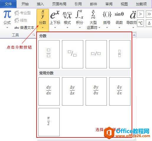 步骤二、点击【公式】按钮,弹出新的窗口,接着点击【分数】按钮,选择需要的分数样式。如图所示: