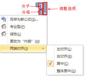 步骤四、分别点击分数线的上面和下面输入分子和分母。其中右边小三角可以调整分数的对齐方式。例如二分之一,如图所示: