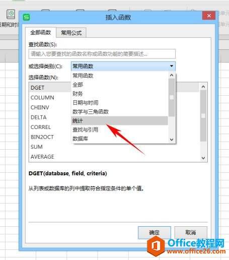 在插入函数对话框中,选择类别处选择统计函数,如图。