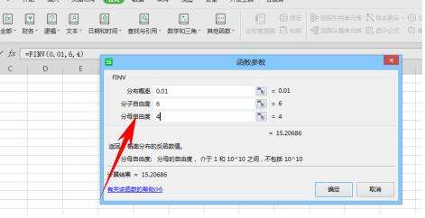 鼠标单击确定选择该函数,弹出函数参数对话框。在该对话框内填入数据。0.01(与 F 累积分布相关的概率值)、6(分子的自由度)、4(分母的自由度)。