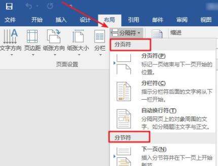 3、点击后,展开分隔符,即可看到分页符和分节符。