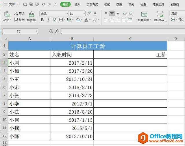 首先,我们看到如下表格,在表格当中有员工的姓名和入职时间。