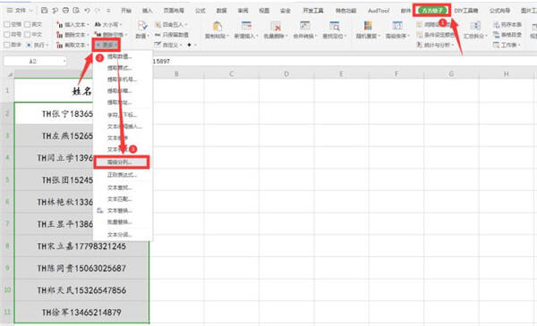 这里我们要用到一个插件,那就是“方方格子”,如果没有插件的话,可以网上自行下载,“方方格子”与WPS完美兼容。点击工具栏上的【方方格子】,选择下方的【更多】,最后点击【分列】: